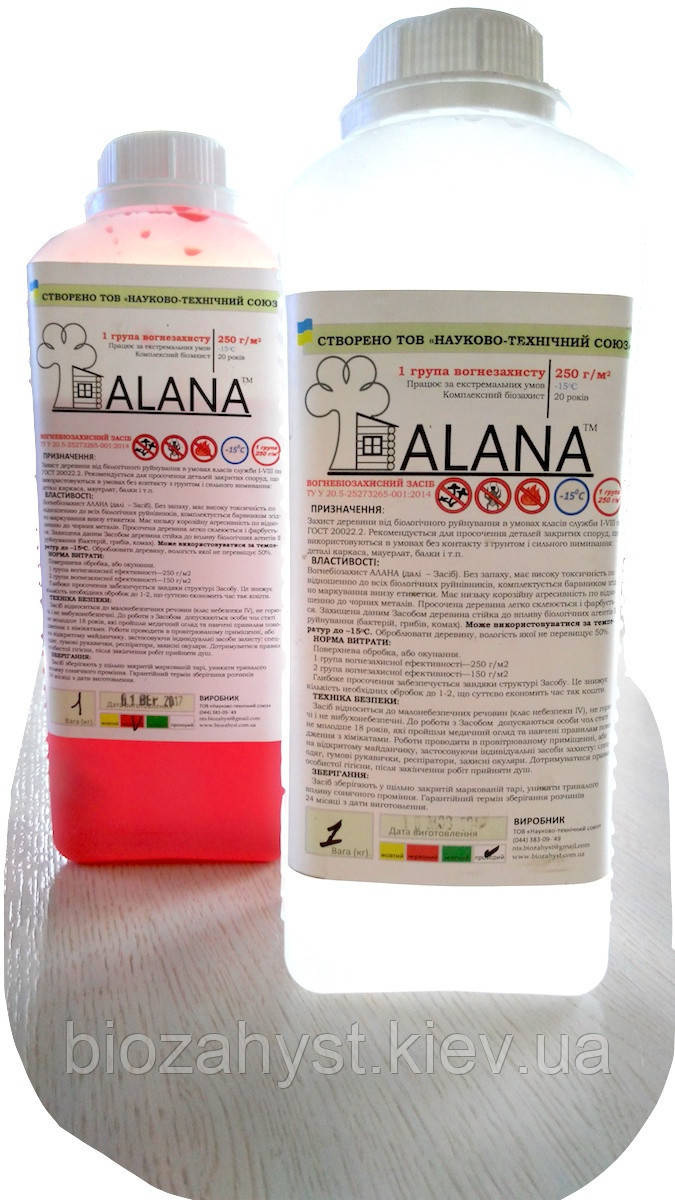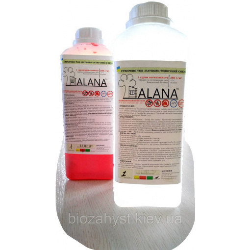 Унікальна запатентована розробка, вогнебіозахист АЛАНА це препарат останнього покоління. Кислотна основа дає можливість глибоко проникати в структуру дерева і створює там активний вогнебіозахисний шар. Оброблена деревини на 60% зменшує поглинання вологи, що дає істотну до 2х разів економію при подальшій обробці дерева лаком або фарбою.
