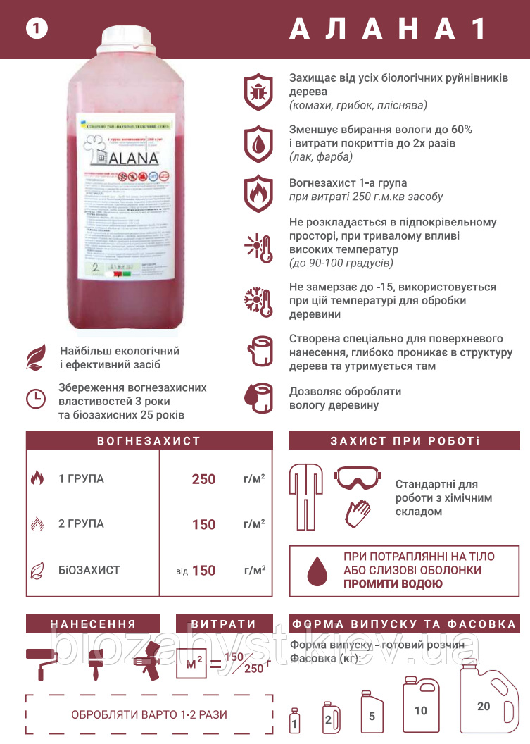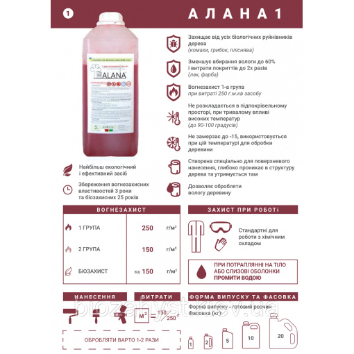 Унікальна запатентована розробка, вогнебіозахист АЛАНА це препарат останнього покоління. Кислотна основа дає можливість глибоко проникати в структуру дерева і образовует там активний вогнебіозахисний шар. Оброблена деревини на 60% зменшує поглинання вологи, що дає істотну до 2х разів економію при подальшій обробці дерева лаком або фарбою.