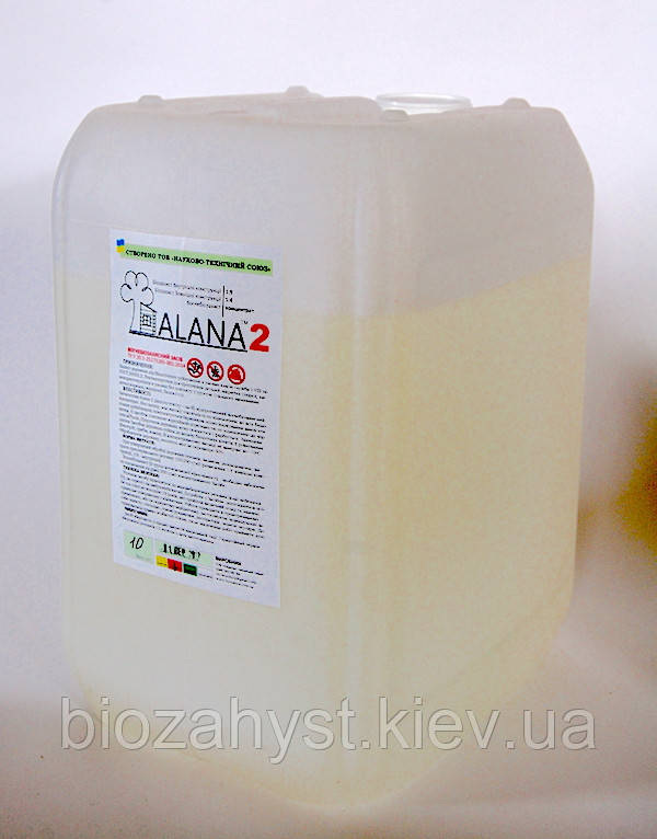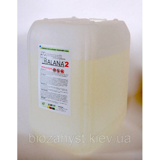 АЛАНА2 з вогнебіозахисним складом для обробки деревних конструкцій використовуються всередині і зовні приміщень. Особливістю АЛАНА2 є те, що вона є концентратом. Це означає, що Ви можете дуже вигідно обробити свою будівлю і при цьому бути впевненим в якості захисту. Так для зовнішніх конструкцій концентрація становить 1:4 а для внутрішніх 1:9. Таким чином з 1 кг концентрату, ви можете отримати 5 кг для обробки зовнішніх конструкцій та 10 кг для обробки внутрішніх конструкцій.