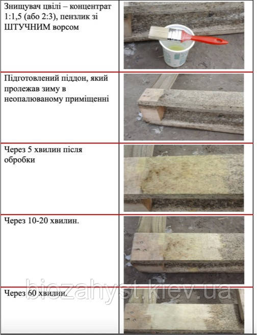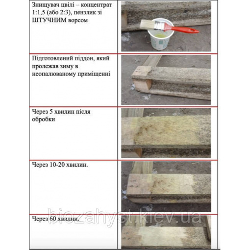 Знищення плісняви та грибка. Працює по мінеральних поверхнях та відбілює деревину до природного кольору. Потрібно нанести на очищену від наростів плісняву та грибок поверхню. Зачекати до повного висихання. У разі потреби провести повторну обробку.