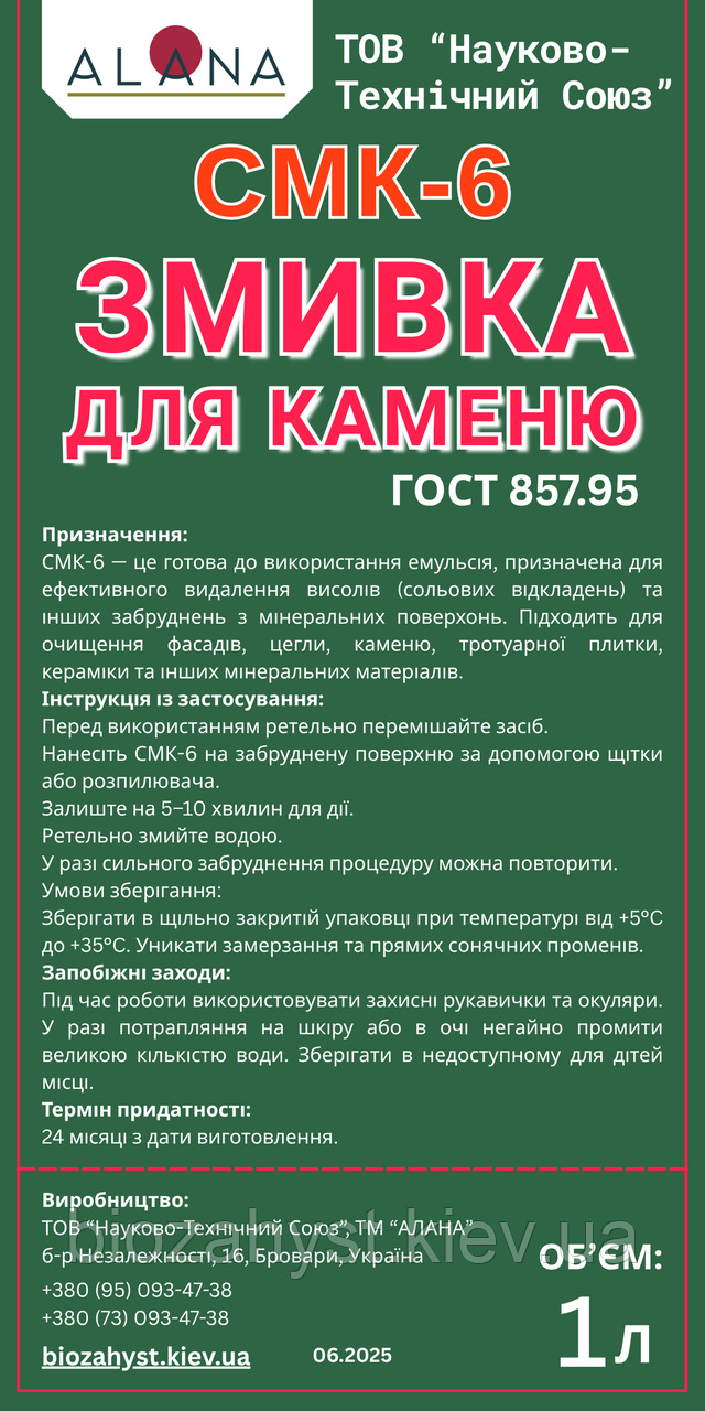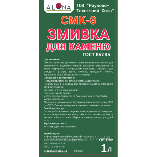 Змивка для каменю СМК-6 виробництва торгової марки АЛАНА – ефективний засіб для очищення та відновлення привабливості мінеральних поверхонь. Завдяки спеціальній формулі, яка відповідає ГОСТ 857.95, вона ефективно усуває соляні відкладення (висоли), забруднення та інші стійкі плями.